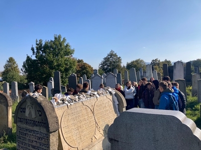 Po prohlídce synagogy jsme se přesunuli na nedaleký židovský hřbitov. Tam jsme obdivovali náhrobky známých židovských rodin, Jelínků, Singerů, ale také vzácnou tumbu samotného rabína Šacha.