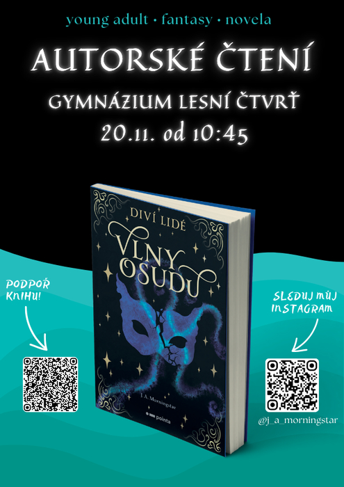Ve čtvrtek 20. listopadu 2025 se konala beseda s Jiřím Pompou alias autorem píšícím pod pseudonymem J. A. Morningstar. Autorské čtení z knihy Diví lidé-Vlny proběhlo v rámci hodin českého jazyka ve třídách 2.D, kvarty B, kvinty A a sekundy A.