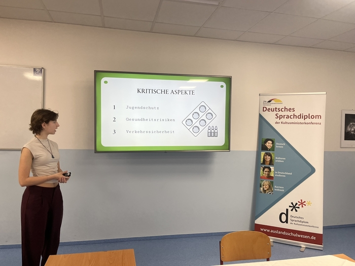 Ústní část této zkoušky prověřuje jak důkladnou přípravu na vybrané odborné téma s prezentací před zkušební komisí, tak schopnost ve dvacetiminutovém přípravném čase zformulovat krátký výklad na neznámé téma. V obou případech poté následuje rozhovor na obě témata se členy komise. Kandidát/ka tak musí prokázat schopnost pohotově a zasvěceně reagovat na dotazy, plynule rozvíjet dialog, a to kvalitním jazykový projevem. Naši němčináři letos referovali např na tato témata: Použití vodíku jako relevantního paliva v německém automobilovém průmyslu, Umělá inteligence jako hrozba či šance na německém trhu práce?, Řešení nedostatku praktických lékařů v německých venkovských oblastech...